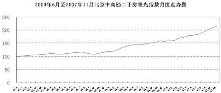 據北京中原三級市場部研究中心對監測樓盤統計,2007年11月北京中高檔二手房成交價格為12973.9元/平方米,11月二手房買賣領先指數為215點,環比10月上漲3.77%。而10月環比9月價格增幅為3.8%?梢,11月中高檔二手房價格增幅同10月份價格增幅相比有所趨緩。但從11月成交量上來看,環比10月卻有所下降,降幅達9%左右。