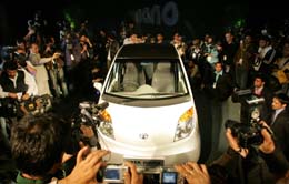 印度塔塔汽車公司近日在新德里舉行的一個汽車展上推出一款名為名為Tata Nano的小車,售價預計為2500美元。業內人士對這款價格超低的新車褒貶不一。塔塔汽車公司董事長拉坦·塔塔說,在印度,許多四口之家共乘一輛摩托車出行,父親駕駛,母親坐后座,中間夾坐著兩個孩子。他希望這款價格低廉的新車能讓工薪族家庭的出行更為安全,并促使其他汽車企業降低車價。新華社/法新