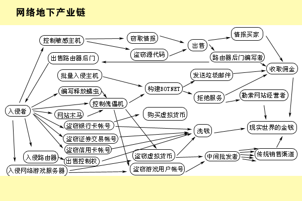 “網絡黑金市場到底有多龐大,恐怕誰也說不清楚。我保守估計,中國一年至少有十幾億元在里面涌動。黑客干得好的,一年隨便搞幾十萬元一點問題都沒有。即使干盜號的,你也別小看,做得好的,一個月賺幾萬元很輕松。 網絡世界亂象叢生,主要還是經濟利益在驅動。有的黑客為了賺錢,各種損招都用上了。此外,監管不力也是原因之一。政府在打擊網上黃、賭等方面力度很大,對網絡攻擊行為的打擊卻比較少。當然,監管也確實有難度,比如盜個號,錢也不多,公安機關怎么去立案?類似的事情很多,查起來也比較難! 采訪鏈接:中國工程院院士方濱興說,在國外,一萬臺僵尸網絡“肉機”,出租一周可以獲利700美元。在中國,由于僵尸網絡太多,同樣的標準只能獲利900元人民幣。 中國現代國際關系研究院信息與社會發展研究室副主任唐嵐說,目前國內、國外都是一樣,網絡地下產業鏈很繁榮。網絡黑金市場規模龐大,而且還出現了與傳統的犯罪團伙勾結在一起的新趨勢,這對今后加強管理是個嚴峻的挑戰。如何防范和打擊網絡犯罪已經成為信息安全領域的重要問題之一。