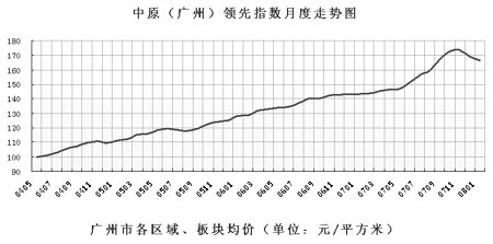 2008年1月,中原(廣州)領先指數為166.6,環比上月下降了2.4,降幅為1.5%。受買家觀望、市場成交不暢、一手房降價促銷等因素影響,中原領先指數1月繼續下行態勢。雖然1月份市場整體依然觀望,而且臨近春節是傳統的淡季,但因為部分剛性需求在1月集中釋放,所以交易量未繼續下降,支撐價格指數的下降幅度也有所收窄。