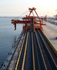 日前,國投曹妃甸煤炭碼頭一期工程基本完工,將于6月份投產。國投曹妃甸煤炭碼頭規劃建設5至10萬噸級煤炭泊位16個,年煤炭下水能力2億噸。這是曹妃甸煤炭碼頭安裝完畢的裝船機。 本報記者:楊世堯