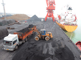 受1月中旬國內南方地區遭受冰凍災害影響,廣西各大電廠燃煤需求量增加,2008年前兩月,廣西欽州港完成煤炭吞吐量101.8萬噸,比2007年同期增長227.8%。圖為一輛煤炭運輸車在欽州港勒溝作業區運煤。