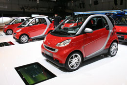 吸引了30多個國家和地區的260多家汽車廠商參展的第78屆日內瓦國際車展,節能環保成為關注點,圖為FORTWO微型車列隊展出。新華社記者:楊京德