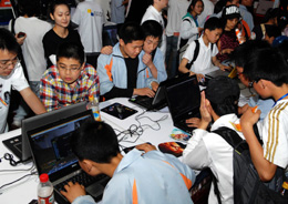日前,第四屆中國國際動漫產業博覽會在杭州開幕。在看似簡單的電子游戲、動畫片等動漫產業終端產品的背后,是一整條包括科技研發、制作、銷售和動漫形象衍生產品開發的產業鏈,據估計,中國動漫游戲產業年總產值在180億元左右。圖為一些學生圍聚在電腦前嘗試新的電腦游戲。