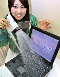 日前,日本電氣公司(NEC)的雇員在東京展示一款新型防水電腦“Shield Pro”。這款電腦采用英特爾雙核處理器,配備12.1英寸顯示器和防水機身,預計將于6月上市銷售。