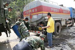 四川汶川大地震發生后,由于肩負成品油入川主動脈的蘭成渝管線緊急停輸,寶成鐵路運輸中斷,四川成品油庫庫存告急。特別是隨著大批救援車隊的源源不斷進入,成品油供應異常吃緊。 “面對突如其來的地震災情,中國石油緊急召開會議,就抗震救災做出全面部署!敝袊图瘓F公司宣傳處的李生儒告訴記者,“集團公司黨組書記、總經理蔣潔敏任抗震救災領導小組組長,副總經理王宜林率隊趕赴災區一線。隨后銷售公司副總經理田景惠也趕赴災區,一場油品保供攻堅戰由此展! 中國石化集團信息處處長章治國說,地震發生后,正在大連參加中央企業負責人培訓班的中國石化集團黨組書記、總經理蘇樹林立即趕回北京,主持集團公司黨組會研究部署抗震救災工作;中國石化先后派出4名黨組領導趕赴災區現場組織抗震救災。 據介紹,兩大石油公司幾乎不約而同地啟動了應急預案,采取非常手段,加強災區成品油供應。 中國石油集團公司迅速做出向災區緊急調撥增供10萬噸成品油的決定。13日,其華東銷售公司迅速通過長江水陸向四川搶運增供的2萬噸油品;西北銷售公司也通過公路向四川綿陽、德陽和廣元重災區送油。14日凌晨,滿載東北銷售公司7500噸成品油的專列,分別從大連、遼陽、錦州起運,發往四川災區……到16日下午2時,四川地區的成品油庫存開始超過20萬噸,恢復正常水平。 而中國石化從5月12日到21日之間,累計向災區調運成品油7.2萬噸,保證了部隊、鐵路機車、航空用油和抗震救災車輛用油。