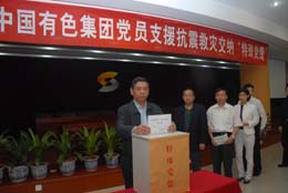 四川汶川地震牽動著中國有色集團全體共產黨員的心,他們踴躍交納“特殊黨費”,支援災區建設。短短半個小時,集團公司總部和在京企業422名黨員自愿交納特殊黨費40.5643萬元。圖為集團總經理、黨委副書記羅濤,黨委書記、副總經理張克利交納抗震救災“特殊黨費”。王長明