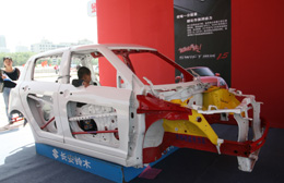 5月24日,中國汽車安全主題巡展在長春文化廣場舉行,展會上各家廠商分別宣傳演示了自己公司產品在安全方面的特點和優勢。圖為一家廠商在展示車骨架的安全設計。