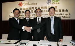 6月2日,中國聯通董事長兼首席執行官常小兵(右二)、中國網通董事長兼首席執行官左迅生(左二)、中國網通執行董事兼首席財務官李福申(左一)與中國聯通執行董事兼首席財務官佟吉祿出席新聞發布會。當日,中國聯通股份有限公司(中國聯通)與中國網通集團(香港)有限公司(中國網通)在香港聯合宣布,雙方將通過換股方式實施合并。中國聯通還宣布,將向中國電信出售CDMA業務。(新華社記者:周磊 攝)