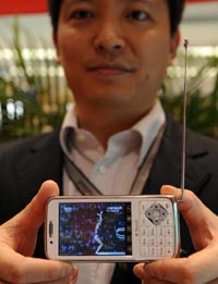 日前,中國首個移動多媒體體驗中心在北京中關村揭幕,這標志著中國的移動多媒體廣播全面進入商用時代。北京奧運會期間,人們可以通過手機等便攜電子產品隨時隨地看奧運比賽。圖為創毅視訊科技有限公司工作人員在展示用手機收看電視。