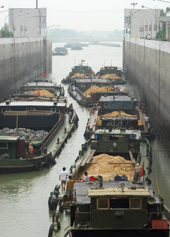 7月1日,裝載貨物的船隊通過臺兒莊船閘。受近期油價上漲因素的影響,水上運輸以其運量大、運費低、環保節能等多方面優勢成為運河沿線眾多企業大宗貨物首選運輸方式,使京杭運河山東臺兒莊段更加繁忙。