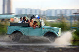 7月12日,在俄羅斯首都莫斯科前圖希諾機場(Airport Tushino),人們開著吉普車從水中駛過。當日,2008汽車風情展(Autoexotic 2008)莫斯科站正式對公眾開放,汽車愛好者們開著自己的愛車聚集在這里,交流車技和改裝、保養車輛的知識,分享對汽車和駕駛的熱愛之情,觀看表演品嘗美食,享受夏日時光。