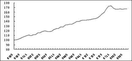 2008年6月,中原(廣州)領先指數為167.3,環比下降0.1個百分點;成交量比上月的小高潮有明顯回落,整體成交價小幅下調。從半年的趨勢來看,廣州二手房價格走勢以平穩為主。