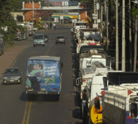 國際油價的大幅上漲使得石油嚴重依賴進口的巴拉圭面臨嚴重的能源危機,巴拉圭石油公司(Petropar)至今仍拖欠外國石油公司3.2億美元的費用,國內成品油供應嚴重不足。近30%的公交車和出租車因為缺油無法工作,正在收割季節的農業部門也因為燃油供應不足蒙受巨大損失。圖為7月15日,巴拉圭首都各加油站的運油車在巴拉圭石油公司大門前排起長隊,等待加油。