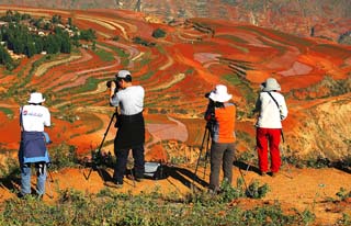 云南東川的紅土地總面積達20平方公里,一年四季中,洋麥花、蕎子花、油菜花和蘿卜花等交替開放,色彩斑斕,成為著名旅游景觀。圖為幾位攝影愛好者在東川拍攝紅土地。本報記者:楊牧源