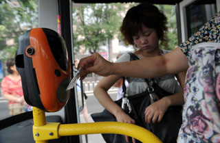 交通一卡通、北京交通網實時路況查詢、96166交通服務熱線、動態交通導航、城市道路巡查管理系統等智能化的交通體系在北京交通系統中廣泛運用,為服務奧運、方便市民出行、緩解擁堵提供了有效的科技支持,提高了交通服務質量。圖為乘客正在刷一卡通乘公交車。