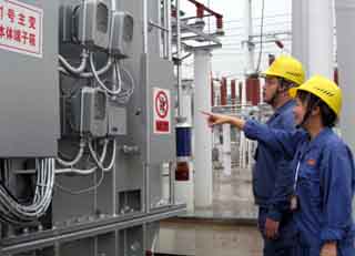 四川省江油市220千伏大康變電站日前舉行竣工投產儀式,這標志著國家電網四川省電力公司受損設施原地重建工作全面完成,轉入規劃重建階段。汶川大地震導致四川省電力公司35千伏及以上變電站停運171座,包括配網線路在內10千伏及其以上線路停運2769條,造成公司系統財產損失106.5億元。圖為四川江油市大康變電站職工正在檢查設備運行情況。
