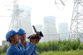 安徽淮南供電職工利用紅外線測溫儀對大唐洛河發電廠輸往華東電網線路進行監測,確保電網安全運行。新華社發(陳彬