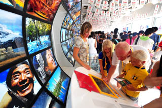 奧運催生了北京新的商圈,奧林匹克中心區周圍的商業物業面臨新的發展機遇。圖為游客正在奧林匹克中心區的一個贊助商展館內參觀。