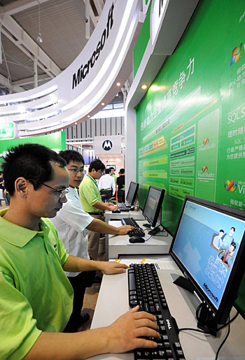 9月24日,微軟公司展位工作人員在進行產品與技術展示。當日,以“軟件外包與數字城市”為主題的第四屆中國(南京)國際軟件產品博覽會在南京國際博覽中心開幕。22個國家和地區組團或派代表參會,包括微軟、摩托羅拉、英特爾、富士通、惠普、富士康、愛立信等在內的338家企業參展。