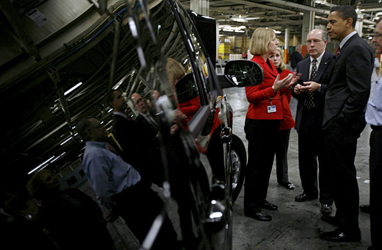 10月13日,通用汽車公司宣布,由于市場萎縮,通用汽車將在今年年底之前關閉一家位于美國威斯康星州的工廠,該廠成立于1919年,主要生產大型SUV。圖為美國總統候選人奧巴馬2008年2月13日在該工廠參觀時的資料照片。新華社/路透