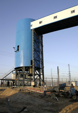近日,呼和浩特鐵路局包頭古城灣萬噸環保煤炭裝車基地基本建成并試運行。這是投入試用的古城灣煤炭裝車基地裝煤塔。