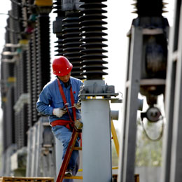 近日,安徽省淮北供電公司利用當前的晴好天氣,加緊對變電站的電力設備進行技術改造,以確保冬季電網的安全運行。圖為淮北供電公司工作人員在變電站更換電力設備。