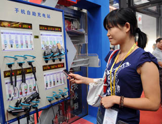 在日前舉行的第五屆中國—東盟博覽會上,設立在展廳內的手機自助充電站為參觀者提供了方便。圖為一名參觀者在查看手機充電情況。
