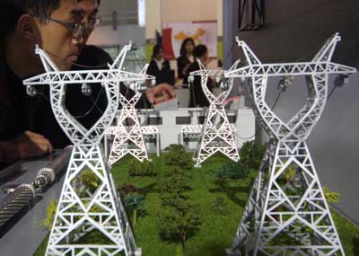 2008中國國際電力電工展日前在北京中國國際展覽中心開幕,來自21個國家和地區的400多家行業巨頭及知名企業亮相此次展會。圖為一家參展商展出的電網模型吸引觀眾駐足觀看。新華社發(吳長青