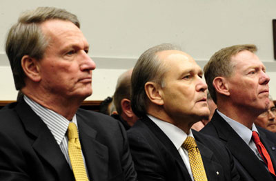 11月19日,美國通用汽車公司董事會主席、首席執行官喬治·理查德·瓦戈納(左一)、克萊斯勒汽車公司首席執行官羅伯特·納爾代利和福特汽車公司首席執行官艾倫·穆拉利(右一)在華盛頓國會山出席眾議院金融委員會就美國汽車工業救援方案舉行的聽證會。本報記者:張巖