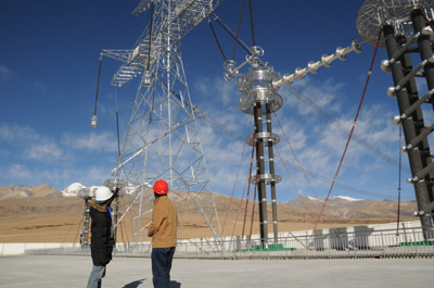國家電網公司西藏高海拔試驗研究基地日前在海拔4300米的西藏拉薩市羊八井鎮投入運行。西藏電力“高原孤島”狀況有望結束。圖為電力工作者在檢查+1000kv直流電壓發生器。