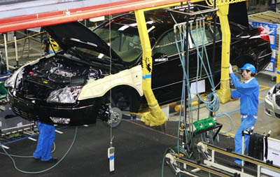 11月25日,工人正在上海通用的流水線上裝配轎車。本報記者:裴鑫