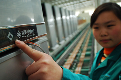 美菱集團2007年、2008年連續兩年被商務部列入“家電下鄉”企業。美菱針對農民的實際需求,在產品設計上,特別采用防潮防銹材料,增加了節能、寬電壓啟動等個性化功能,并采用適合農村路況的包裝設計。圖為工作人員介紹一款“家電下鄉”冰箱的特殊標識。