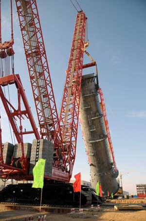 12月6日,中國石化集團第四建設公司人員正在寧夏回族自治區神華寧煤集團烯烴公司施工現場吊裝分離塔。
