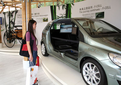 圖為德國戴姆勒公司的展館帶參觀者回顧了汽車的發展史,也展望了汽車發展的未來。展館內展出了世界上第一輛汽車的模型,它的旁邊就是一款能夠“零排放行駛”的梅賽德斯-奔馳B級燃料電池車。杜鵑