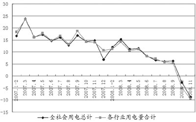 來自電力部門的統計數據顯示,11月份全國用電量同比增長-8.33%,這是在10月份用電量增長-2.18%的基礎上出現大幅下滑。有專家預計,12月份用電量還會繼續下降。 電力向來被視為國民經濟的“晴雨表”,透過用電量的增長可以準確把握產業、行業的發展狀況及宏觀經濟的走勢。 由國網北京經濟技術研究院副院長胡兆光博士繪制的一份“2007年以來各月我國全國及各行業用電量增長速度”圖表(圖1)顯示:全國月度用電量增長率在2007年3月曾高達23.88%,全行業(一、二、三產)月度用電量增長率也達到23.48%。此后便呈起伏式下滑,全國用電量10月份同比增長-2.18%,11月份同比增長-8.33%。 “首先,受全球金融危機影響,我國部分出口行業的用電量增速下滑最為明顯!焙坠庹f,“特別是嚴重依賴出口的紡織業等正在步入衰退期! 記者從他繪制的“2007年以來各月部分出口行業用電量增長速度”圖表(圖2)中看到,紡織業的用電增速在2007年基本維持在10%左右,從今年3月份起開始下滑,7月份為-0.4%,8月份為-0.7%,9月份為-0.79%,10月份為-9.49%,11月份達到-12.34%,已經連續5個月為負增長。服裝鞋帽及其制品業和木材加工家具制造業的用電量也在10月份分別出現-11.17%和-2.98%的負增長,11月份分別為-7.8%和-14.6%的負增長。 胡兆光說:“國際金融危機已經直接影響到我國部分行業的生產經營。盡管我國政府在今年下半年陸續調整出口退稅政策,但從目前看很難扭轉這種下滑的局面! “其次,受國內市場影響較大的黑色、有色行業的用電量也呈現大幅度下降!焙坠飧嬖V記者,黑色、有色行業的用電量增長今年10月份分別為-16%及-8.9%,到11月份更分別降至-24.5%及-14.5%。(圖3)他說:“黑色、有色行業的發展與房地產有直接的關聯。房地產業的不景氣導致對鋼材、鋁等產品的需求不旺!贝送,今年10月份用電負增長的行業還有:印刷、文體用品制造業用電增速分別為-6.5%和-10.5%;化工業為-8.57%,其中氯堿為-28.9%,電石為-27.7%;醫藥制造、化纖制造、橡膠塑料制造業也是負增長。11月份用電負增長的行業已擴大到采礦業為-12.5%,及占全國當月用電量的一半的制造業中的20個行業均為負增長。但建筑、交通、信息服務、住宿餐飲、服務及機關等行業用電增速還是正的。 |