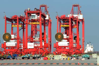 江蘇太倉港蘇州現代貨箱碼頭強化節能減排,2008年投入8000多萬元對數十臺柴油動力輪胎式集裝箱門吊等港口機械設備進行“油改電”技術改造,同時引進新的無污染電動設備,成為全面實現“油改電”改造的港口碼頭。這一環保改造工程使該碼頭每年的二氧化碳排放量減少57%,廢油、廢水等廢棄物排放量減少95%,每標箱作業能耗降低50%。圖為經過“油改電”改造后的電力集裝箱門吊集結在碼頭上。