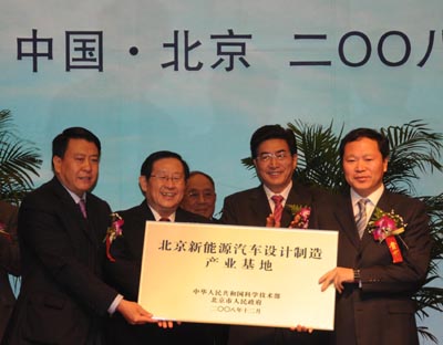 2008年12月28日,北京新能源汽車產業基地落戶北汽福田汽車公司,這是國內首個新能源汽車產業基地。圖為全國政協副主席、科技部部長萬鋼(左二)和北京市市長郭金龍(右二)向北汽控股公司董事長徐和誼(左一)和福田公司總經理王金玉(右一)授予產業基地牌匾。