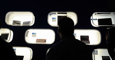參觀者在英特爾公司展臺觀看英特爾推出的移動上網設備。