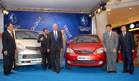 1月19日,馬來西亞副總理納吉布(左三)和中國駐馬來西亞大使劉健(右二)在吉隆坡時代廣場欣賞長安汽車。當日,長安汽車首次在馬來西亞推出兩款車型,希望使馬來西亞消費者也能享受到物美價廉的中國汽車。