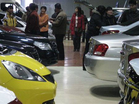 春節期間,不少北京市民前往汽車交易市場,觀車、賞車,選購自己心儀的愛車,汽車市場呈現出熱鬧的景象。圖為1月30日,人們在北京亞運村汽車交易市場內選購汽車。