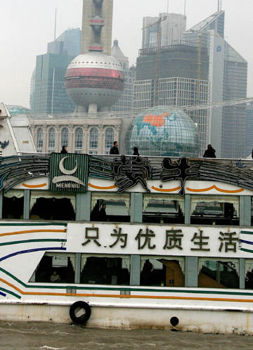 上海市環保局日前發布的信息顯示,截至2008年底,上海市的5976臺燃煤設施實施了清潔能源替代,已超標完成中心城區674平方公里面積“基本無燃煤區”創建,上海市空氣質量已連續6年保持85%以上優良率。圖為一艘游覽觀光客輪從黃浦江上駛過。