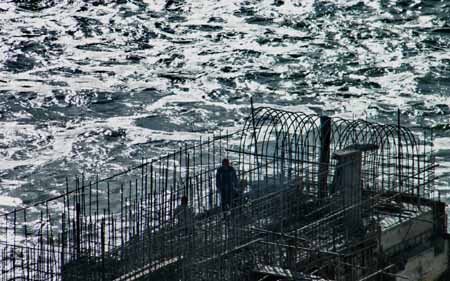 施工人員正在進行黃河龍口水利樞紐大壩分洪口的最后施工。