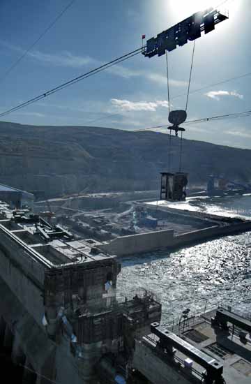 施工單位正在為黃河龍口水利樞紐大壩吊裝發電設備。