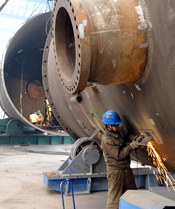 寧夏回族自治區政府今年將投資320億元,加快寧東能源化工基地建設步伐,以應對當前國際金融危機和國內外市場需求變化對當地經濟發展帶來的不利影響。圖為電焊工人在寧夏神華寧煤集團煤化工項目車間加緊施工。