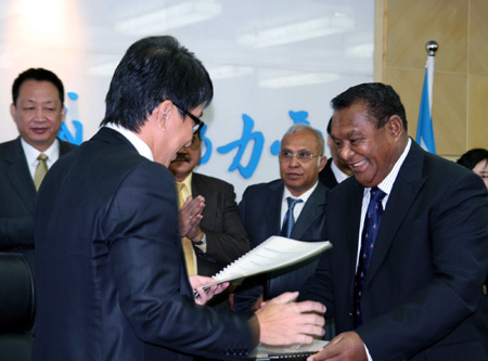 中國民營企業何佳正元(北京)投資有限公司與印度尼西亞馬魯古省政府日前在北京簽署一項合作協議備忘錄,雙方將在電站電網建設和資源開發等方面進行全面合作。根據備忘錄,何佳正元(北京)投資有限公司將投資10多億元人民幣在印尼馬魯古省進行電站電網等項目建設與資源開發。圖為簽約現場。