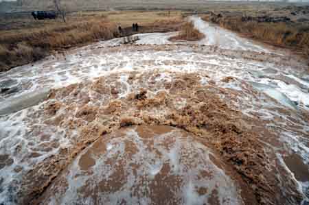 2009年甘肅景泰川電力提灌工程日前向民勤縣調水成功,黃河水流入民勤境內的紅水河。據了解,從2001年以來,景電工程已累計向民勤調水4億立方米,極大地緩解了民勤農業用水,為緩解民勤資源性缺水發揮了重要作用。圖為黃河水流入石羊河支流紅水河。
