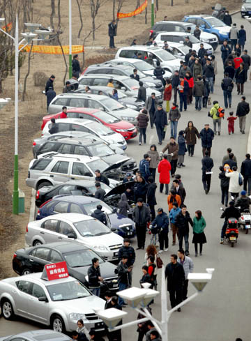 3月15日,市民在沈陽五里河公園參觀選購汽車。隨著汽車進入家庭步伐的加快,交通擁堵、環境污染等一系列新問題又擺在了城市管理者的面前,拼車新政等措施應運而生。張文魁