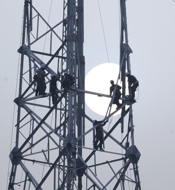 記者從天津市電力公司了解到,為服務濱海新區經濟增長和保障民生,天津今年將投入46億元,進一步加快電力基礎設施建設改造,強化電網對濱海新區經濟社會發展的支撐作用。圖為電力建設者迎著朝陽在濱海新區菜家堡進行高壓電網架設作業。本報記者:劉海峰