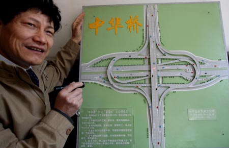 3月24日,劉星良在發布會上介紹《中華橋》。當日,“中華橋”設計者劉星良在北京舉行發布會,介紹他自主設計的這種大型城市單層架空全互通立交橋。他設計的“中華橋”呈“中”字形,向內拐彎,繞行少。創新的設計和明顯的節能減排效果使“中華橋”近日獲授美國專利,并在“第三屆北京發明創新大賽”上榮膺金獎。